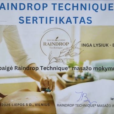2025m. - mokymai "Raindrop Technique" sertifikatas. (Masažo instruktorė Ieva Bukėnienė)