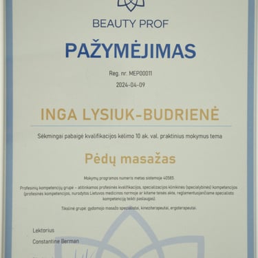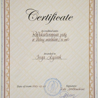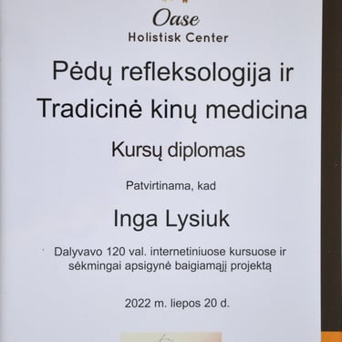 2022m. - Pėdų refleksologijos ir tradicinės kinų medicinos kursų diplomas. (Mokytoja Gedrimė Kušlienė)