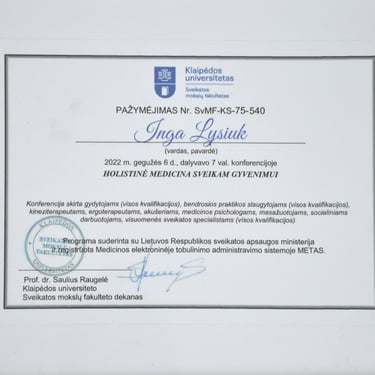 2022m. - konferencijos "Holistinė medicina sveikam gyvenimui" pažymėjimas. (Klaipėdos universitetas)