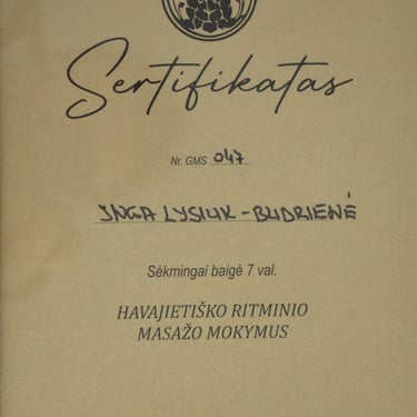 2025m. - Havajietiško ritminio masažo mokymų sertifikatas. (Mokytoja Nijolė Petrauskienė)